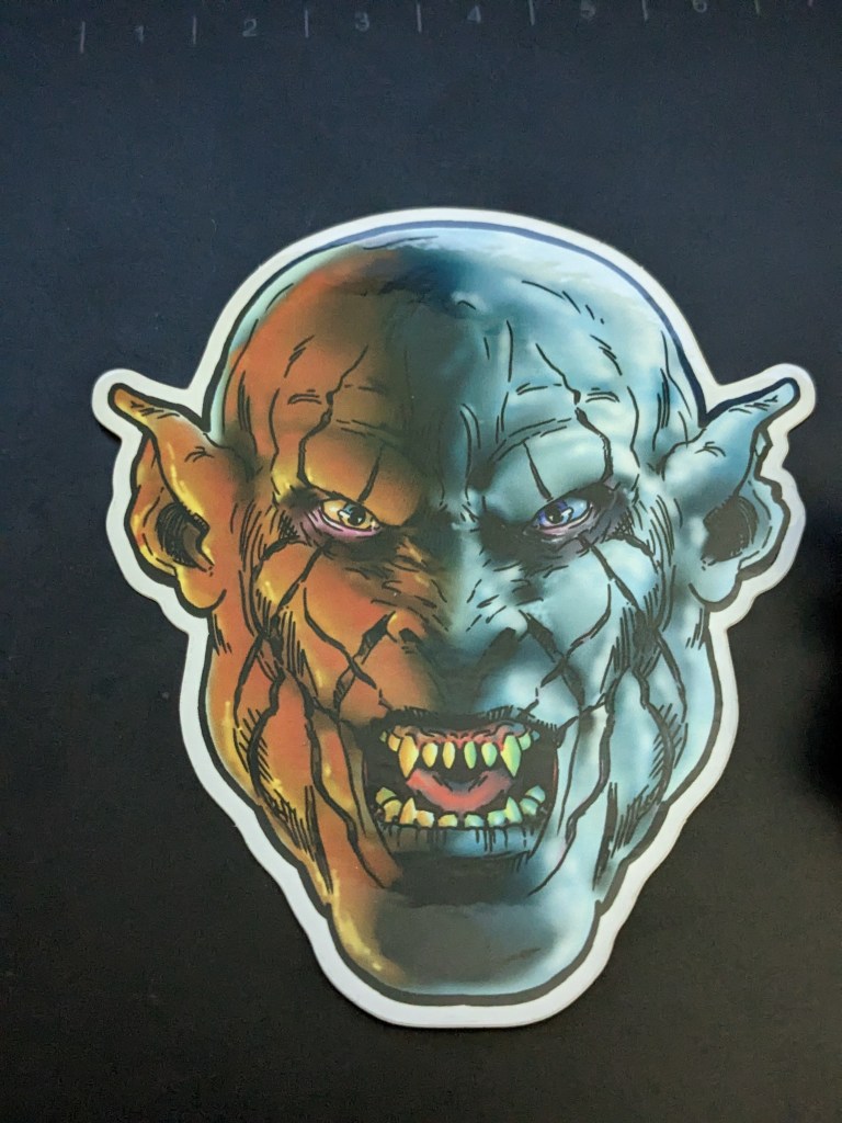 Fast forward some months later and the design is almost coming up in the queue, and I’m asked if I know Azog, from the Hobbit movie. Ah, yes. Can I design a sticker of him? Ah, most definitely! I’ve been designing a lot of Monster stickerheads lately, so it was a snap to switch gears to the big bad Orc hunting Bilbo and crew. Then I find out it debuted at the Style Over Substance table at DesignerCon 2022!